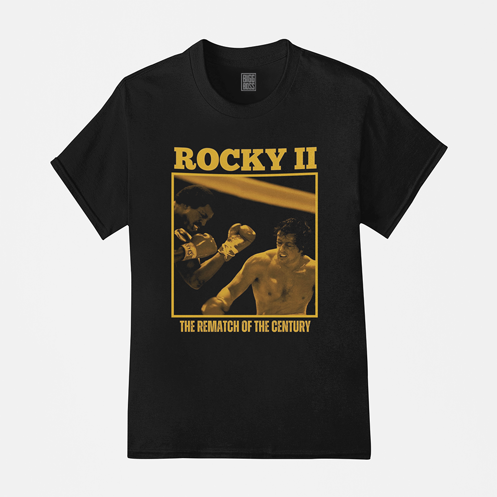 Porque o contraste entre a pose confiante de Rocky e o impacto do título “The Rematch of the Century” transforma essa camiseta em uma narrativa visual.