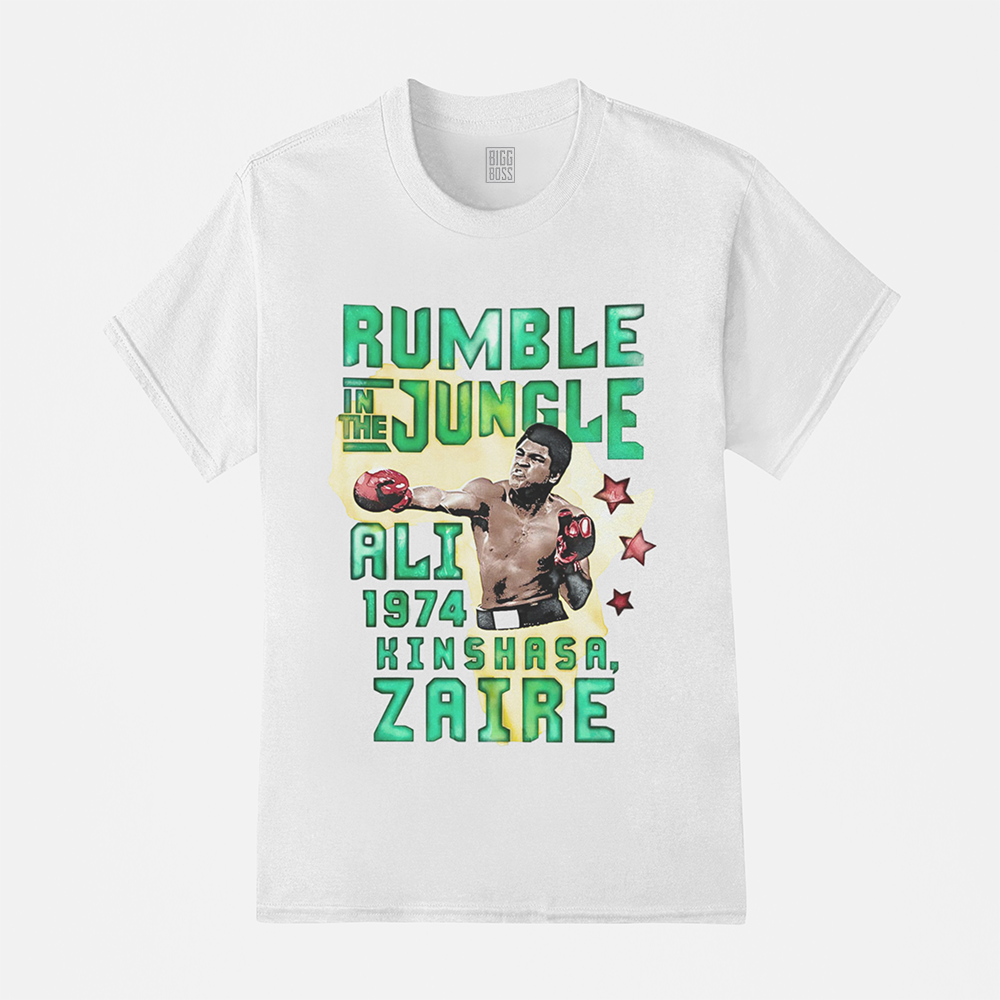 ✔ Estampa: Arte vibrante com a clássica frase “Rumble in the Jungle” e o visual vintage de Ali