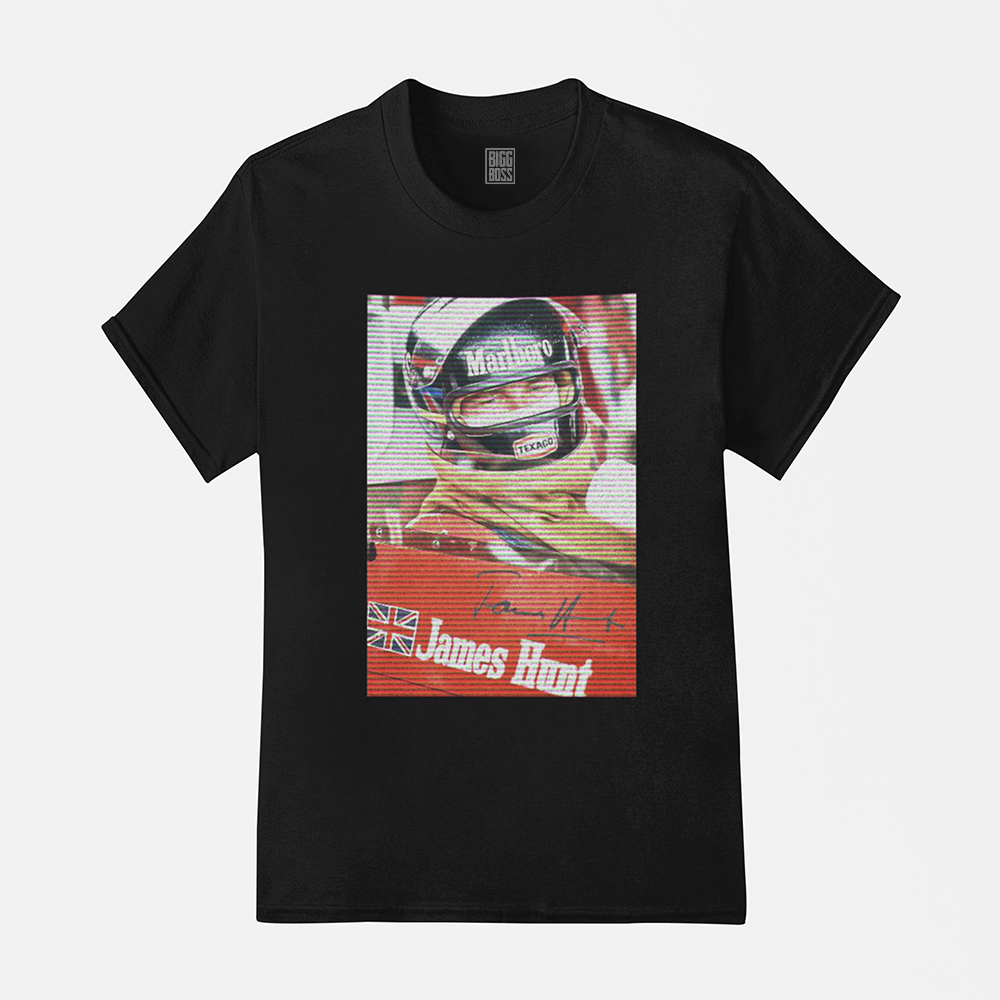 ✔ Estampa: Arte vintage com textura de TV analógica, imagem marcante de Hunt com capacete Marlboro