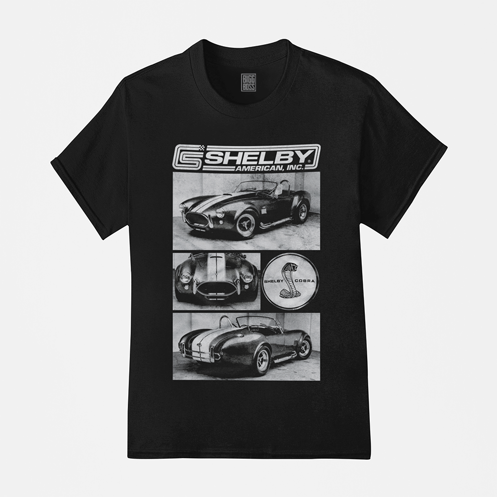 ✔ Estampa: Design vintage em preto e branco com colagens dos lendários Shelby Cobra – pura nostalgia sobre rodas