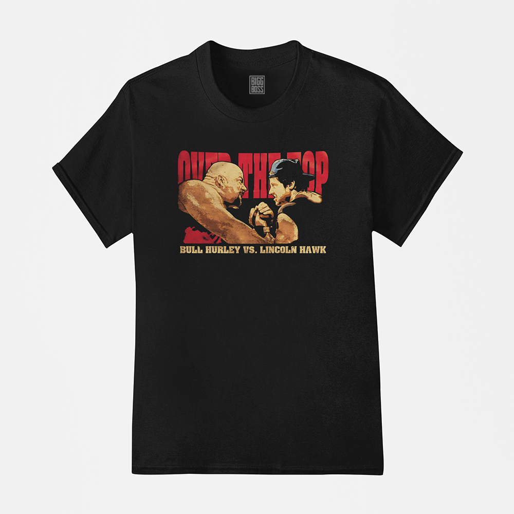 A Camiseta Over The Top – Vs da Bigg Boss captura o clímax do filme de 1987 como nenhum outro item de vestuário. Lincoln Hawk (Stallone) e Bull Hurley se encaram na mesa, mas é muito mais que uma luta de braço — é um duelo de vontades. Essa estampa eterniza o momento em que força, emoção e superação explodem numa única imagem.