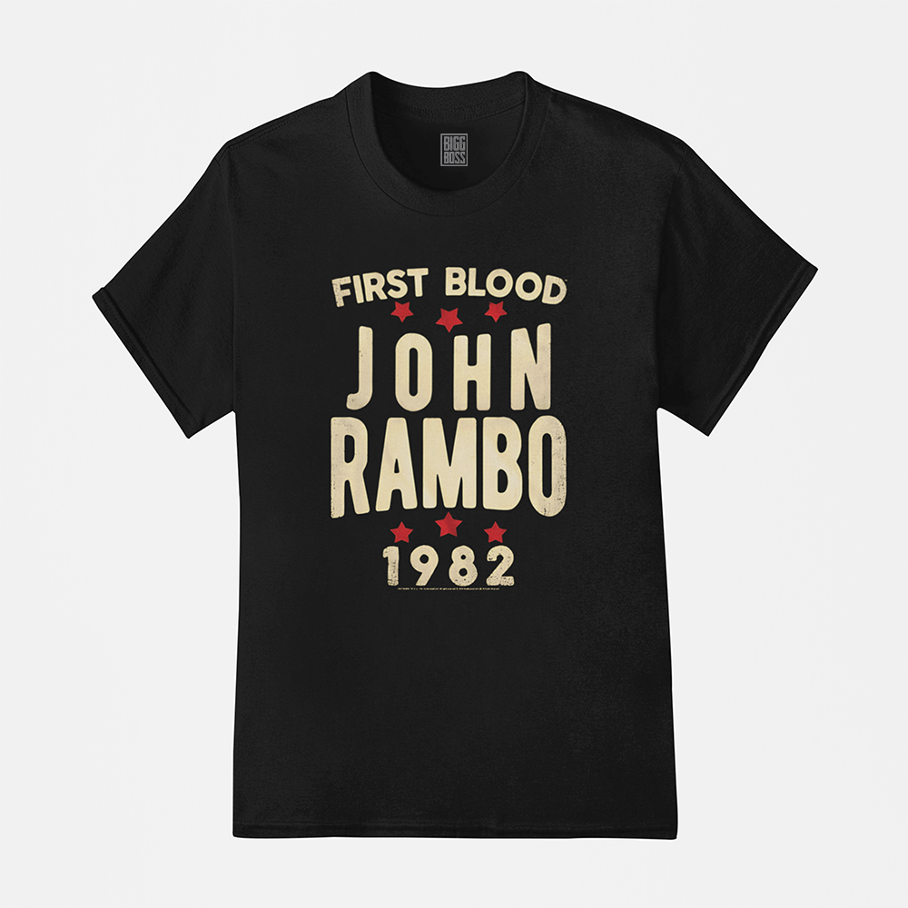 Minimalista e direto como o próprio Rambo, o layout remete ao clima do filme original — um clássico onde menos fala, mais ação. A tipografia com estrelas em destaque reforça a ideia de soldado, combate e legado. Não é só uma camiseta, é uma declaração.