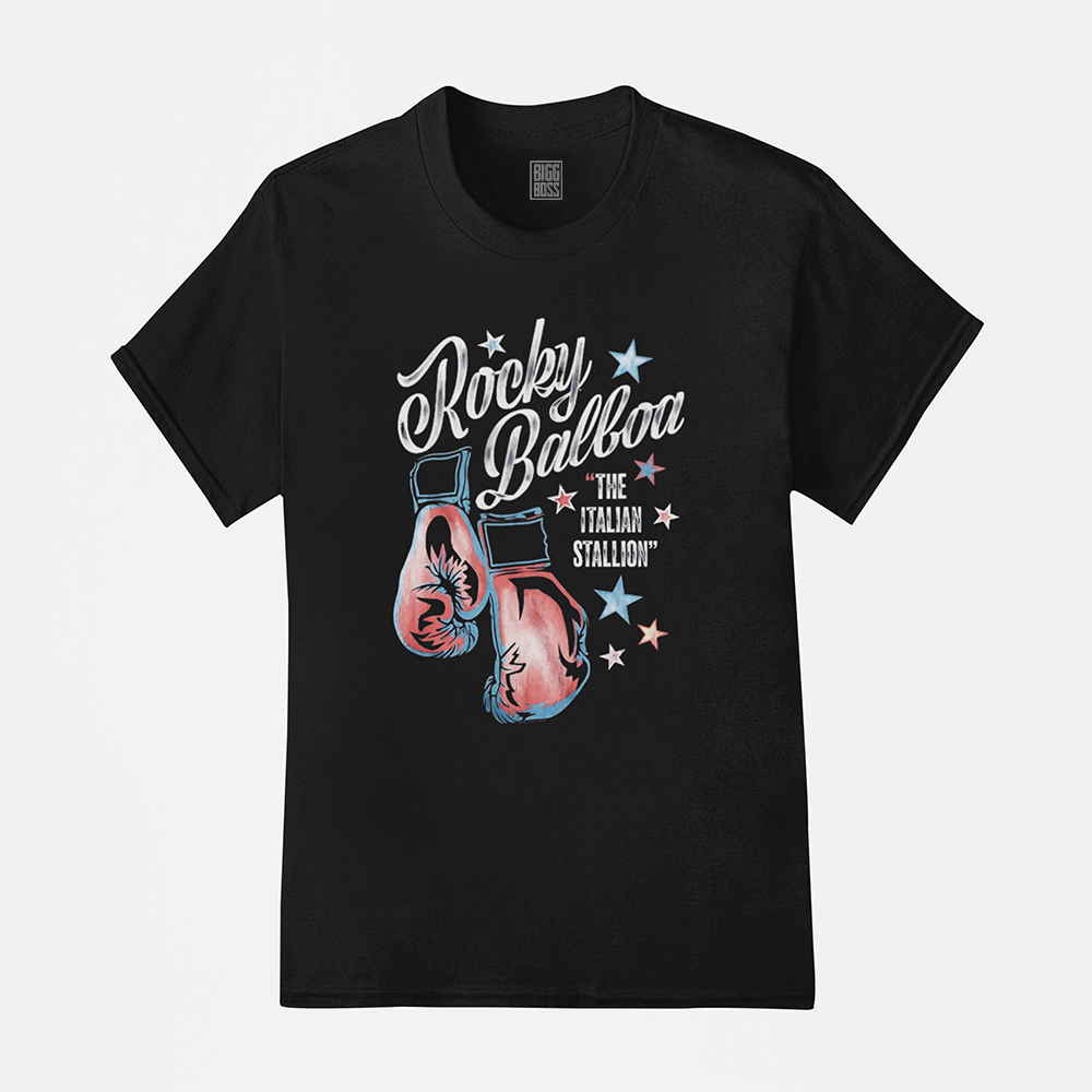 ✔ Estampa: Duas luvas vintage com estrelas e o nome “Rocky Balboa – The Italian Stallion”, em estilo retrô com cores desgastadas
