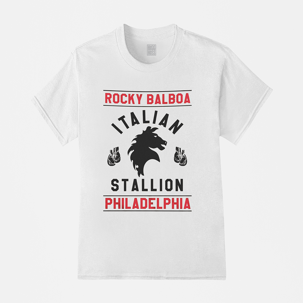 Estampa: Arte central com silhueta do cavalo “Italian Stallion”, luvas de boxe e os nomes “Rocky Balboa” e “Philadelphia” em vermelho vibrante