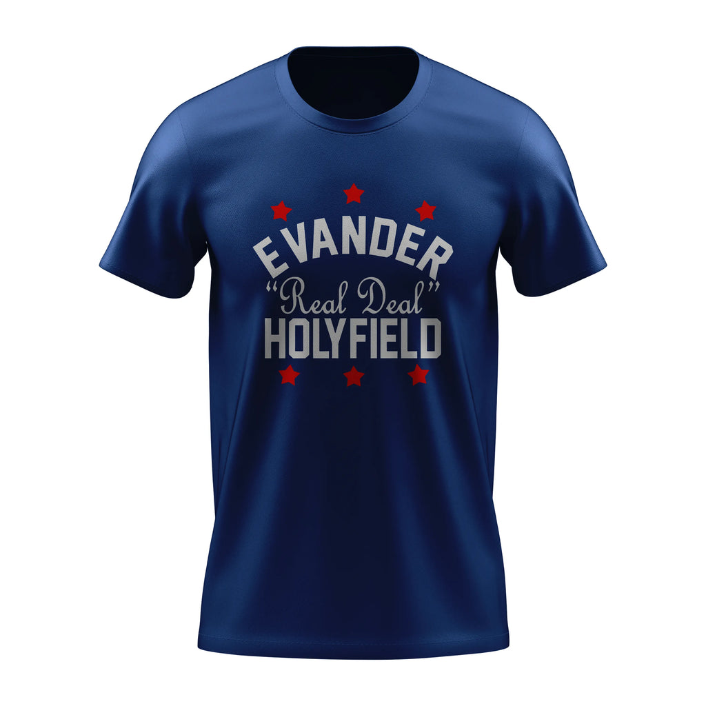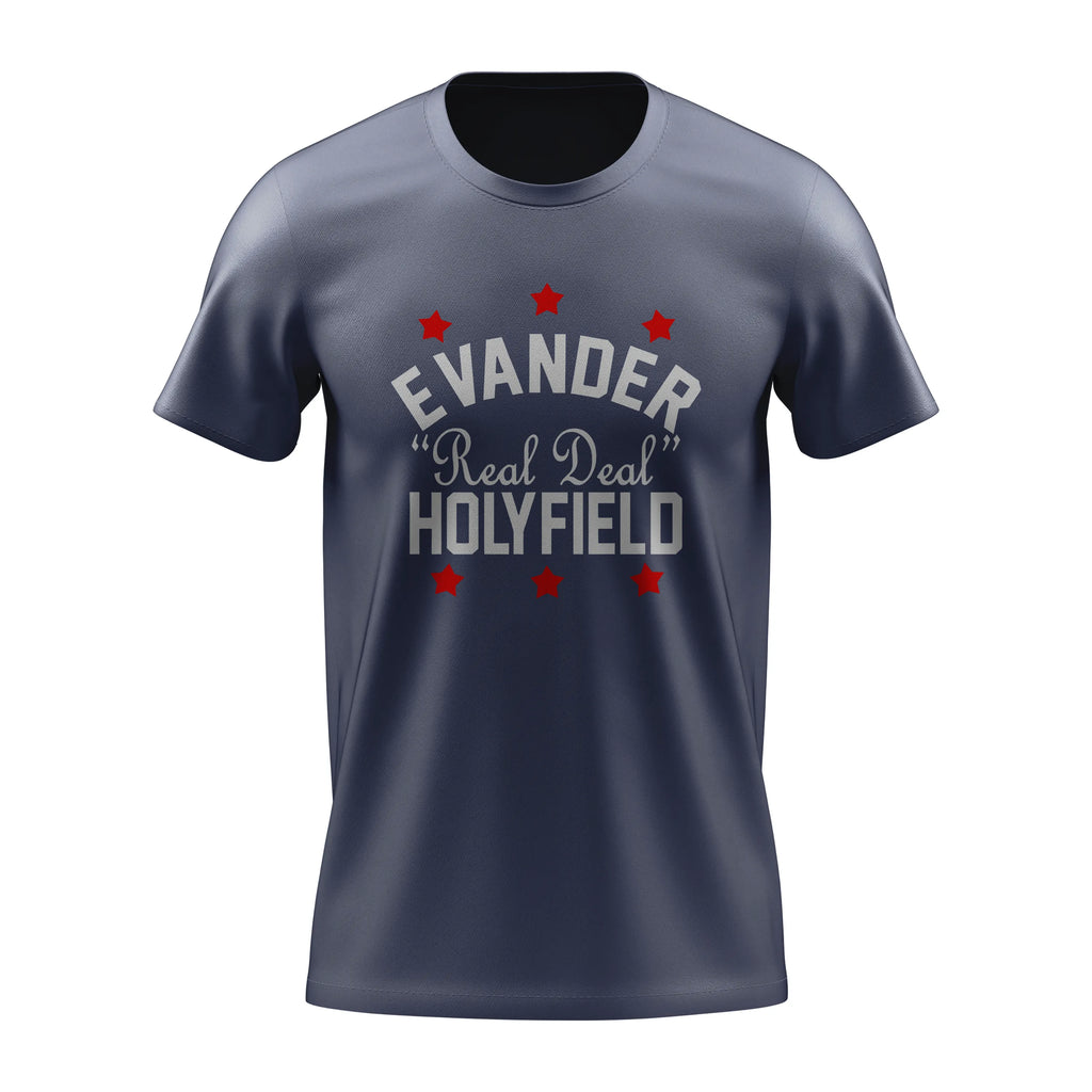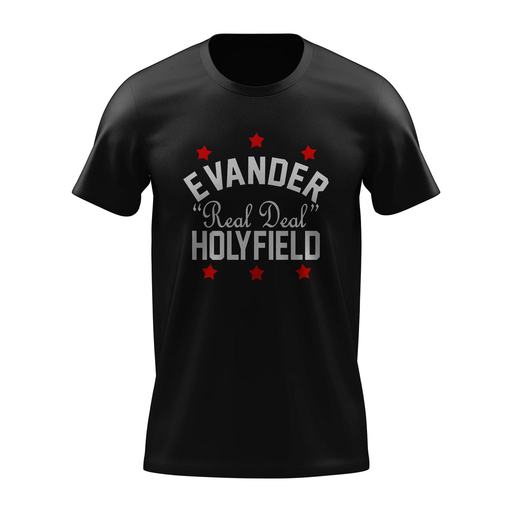 Estampa: arte bold do “Real Deal” Evander Holyfield com detalhes em estrelas vermelhas, realçando sua garra